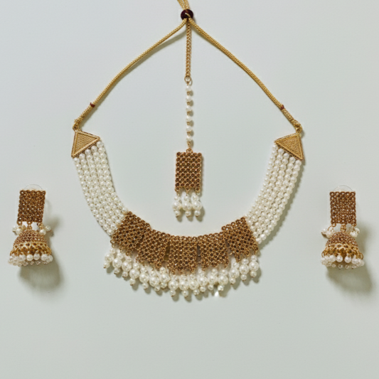 Artificial Pearl Choker Necklace Set with Jhumka Earrings and Maang Tikka - Stainless steel & Tarnish Free