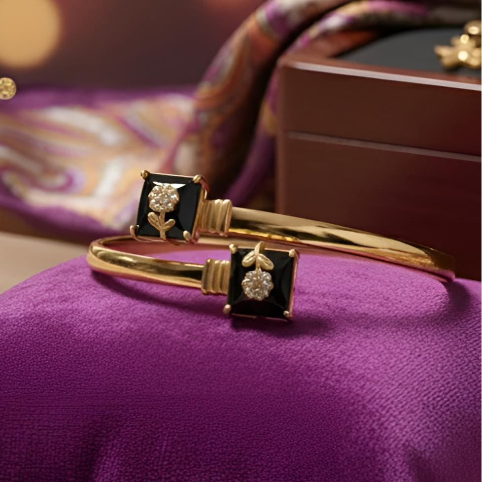 Command attention with our sophisticated Black Onyx and Gold Twist Bangle Bracelet. This elegant piece showcases two lustrous gold-tone bands that gracefully entwine, each adorned with a striking, square-cut black onyx stone. The deep, mysterious black of the onyx creates a powerful contrast with the radiant gold, offering an accessory that exudes modern elegance and timeless allure. Perfect for adding a touch of bold sophistication to any outfit, from evening wear to chic daily ensembles.